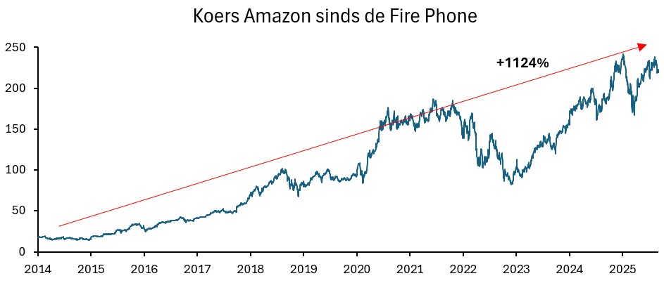 Amazon draait projecten die niet werken razendsnel de nek om. Als het wel werkt, drukt het bedrijf het gaspedaal volledig in. Op Amazon Web Services verdient het bedrijf inmiddels meer dan 100 miljard dollar per jaar. Dat is in één jaar meer dan 400 keer zoveel als de Fire Phone-flater kostte.