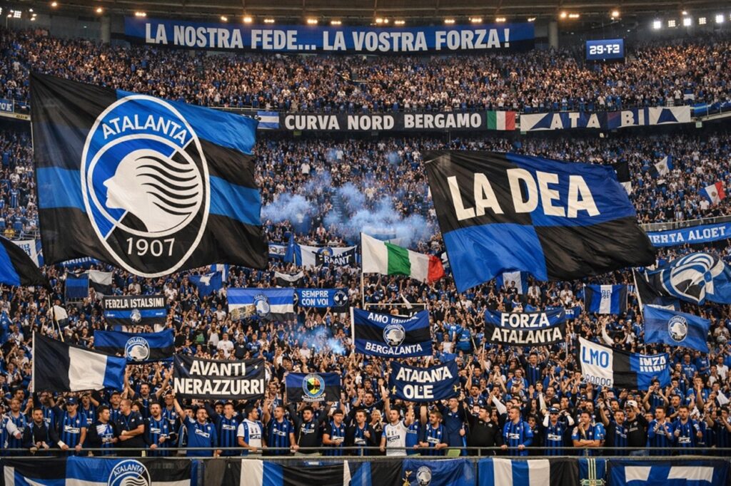 Door AI gegenereerde afbeelding die supporters van Atalanta Bergamo weergeeft, uitsluitend ter illustratie